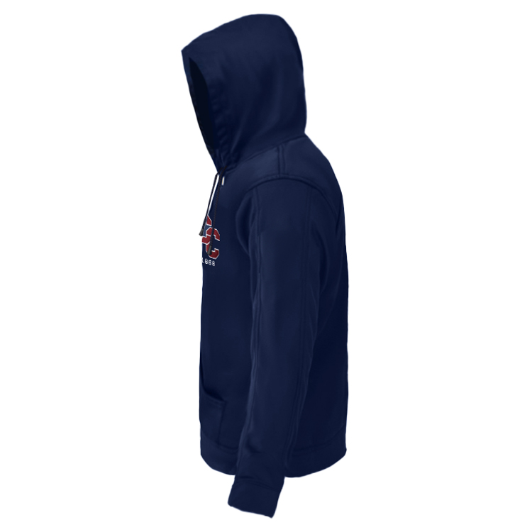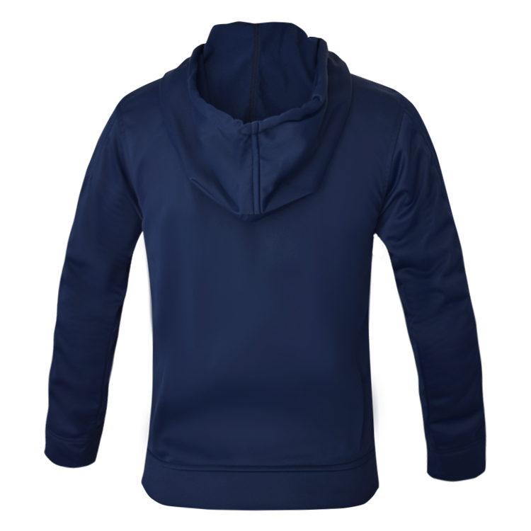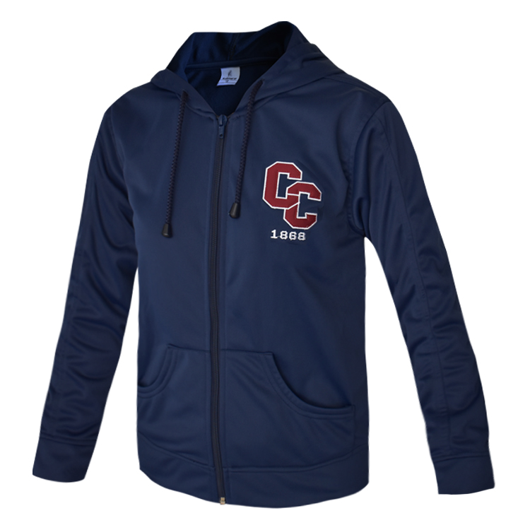 Chaqueta elaborada en Perchado Azul Oscuro referencia Fastrack, con capucha y bolsillo grande frontal, Iniciales de la institución en bordado aplique de color vinotinto.