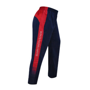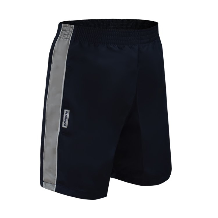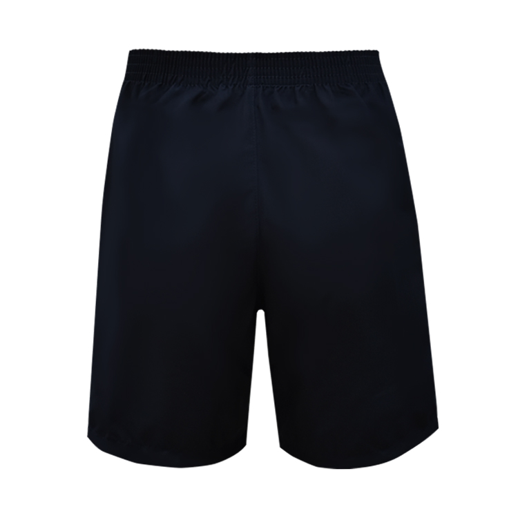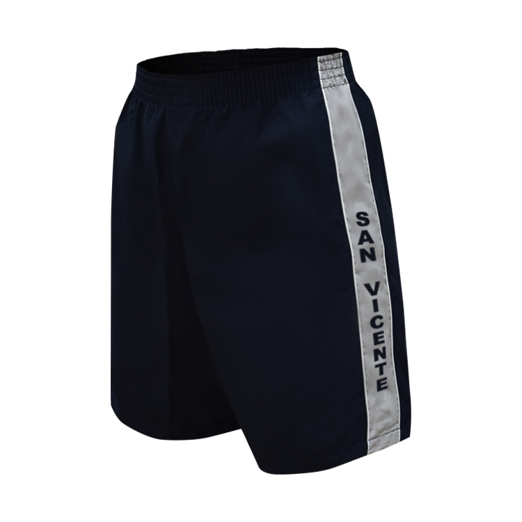 Pantaloneta I. E. San Vicente en tela universal azul turquí antifluido, corte en laterales de color gris, cuatro venas, un bolsillos, estampado nombre de la institucion en color azul turqui sobre la franja de la pierna izquierda.
