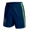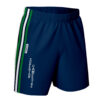 Pantaloneta azul turquí con tres tiras sobrepuestas a cada lado, un bolsillo frontal derecho. Nombre del colegio bordado en sobre tapa frontal derecha.