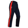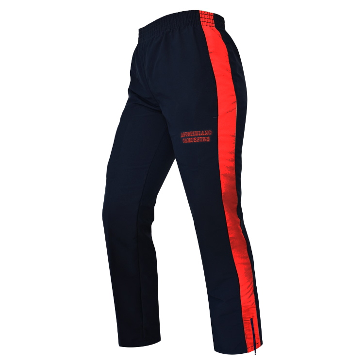 Sudadera Agustiniano Campestre. Tela antifluidos azul turquí y franjas laterales de color rojo, logo del colegio bordado sobre la parte superior izquierda, dos bolsillos y cierre en los laterales en la parte inferior para ajuste manual